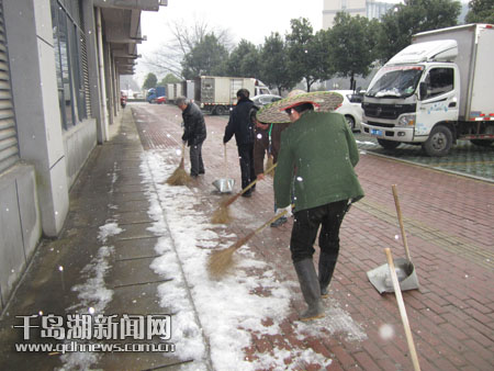 2016年的第一场雪亲临了美丽的千岛湖畔,让整个千岛湖披上了难得的银衣,可谓天与云与山与水,上下一白。对于这次与雪的邂逅,市民们真是有喜有忧。在欣赏美景的同时,积雪也给市民的生活带来了不便,为解决好市民的“忧”, 农贸市场全体党员纷纷行动起来。大家你一铁锹、我一扫帚,积极的投入扫雪活动中。在大家的共同努力下,各菜市场的主要出入通道、消防通道、人行道等路面上的积雪都被清理干净,为市民出行提供了方便和保障。(王建芳)