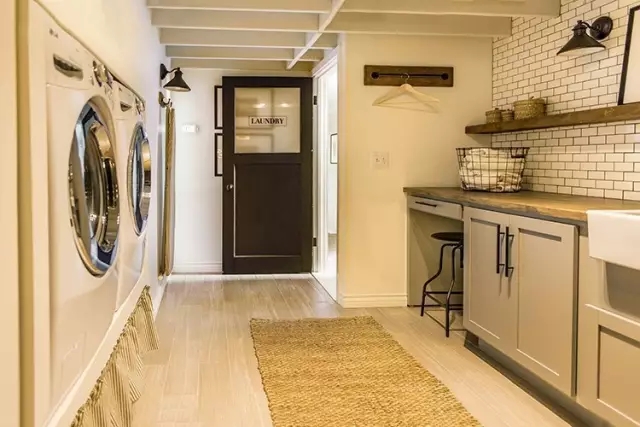 装修后�厨房在装修前有一些简单的装饰,设计师在此次装修中,先撤去了原来的地面铺设,换上了白胡桃实木地板,天花板和墙壁用了木材,并涂上了白色涂料。厨房用灰色基调坐落在房间一角,竹帘式窗帘作为厨房的通风窗装饰,木质餐桌设置在房间中央,同时地面铺有亚麻地毯。在房间的另一侧设置了小吧台,墙面是用仿砖色彩铺设而成,餐厅整体呈白色和亚麻灰色相间的乡村家居风格。 【洗衣室】装修前�装修后�在住宅另一侧的瓷砖水泥房,设计师将它改造成了洗衣室,供居住者洗衣、晾衣、晒衣、熨衣和收纳衣物。业主用蛋壳色地板替换了原来的瓷砖;墙壁换成了白色砖形铺设。对于软装方面,地面用亚麻色厚地毯铺设,衣物收纳间用木质移门另外分隔开,在洗衣房的一侧摆放着洗衣机,另一侧是水槽、挂衣及熨衣处,同时还设有壁挂台,用于摆放各种画饰等装饰物。整个洗衣室,实用又不失文雅。【书房】装修前�装修后�书房地板同样也是用白胡桃木地板铺设,一面墙用深灰色涂料上色,另一面用白色漆料上色,深灰色墙面上安装了壁挂式灯具,分挂在竹帘窗户两侧。转角的桌子下方是木质收纳盒,给书房提供了收纳的空间。【楼下客厅】装修前�装修后�从餐厅下楼到客厅。在硬装上,地板依旧选用白胡桃木地板,另一面墙是花色相间的砖型装饰。在软装上,选用白色亚麻的软垫沙发,抱枕和收纳竹篮来自宜家,窗帘选用白色纱质材质,保证了客厅的采光和通风。【外部小院】装修前�装修后�外部的露天小院是一个面积约为25平方米的阳台,位于阁楼的第三层,可以从小院观赏外部的景致。对于院子的装饰,设计师则是完全运用软装装修的方式。在装修前,院子只是由简单的木板搭建。设计师首先在地上铺设厚实的棉麻材质地毯,再放上宜家竹藤底的软实沙发,配上条纹款和深色款的抱枕,营造了一间露天居室。
