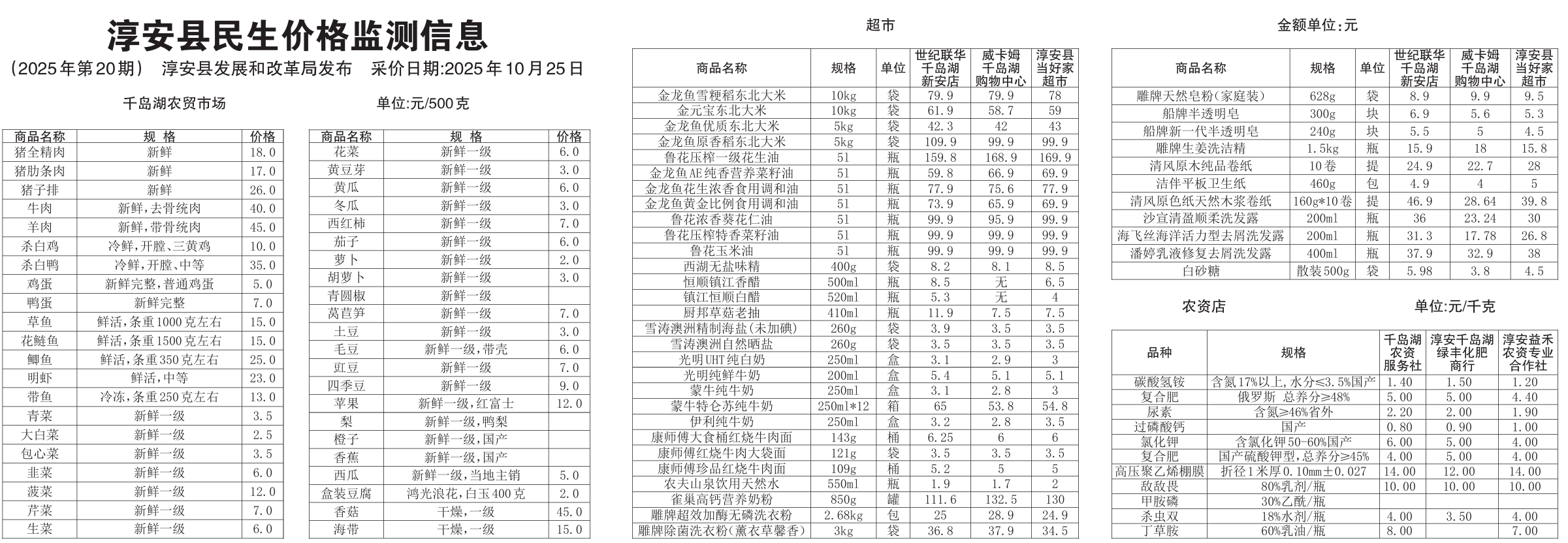 (2025年第20期) 淳安县发展和改革局发布 采价日期:2025年10月25日