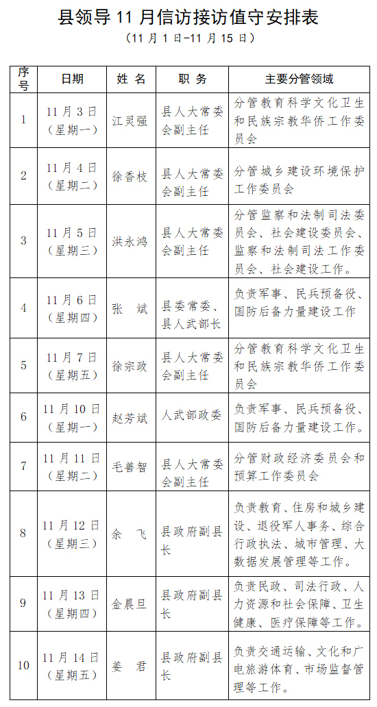 县领导11月接访值守安排表(11月1日—11月15日)