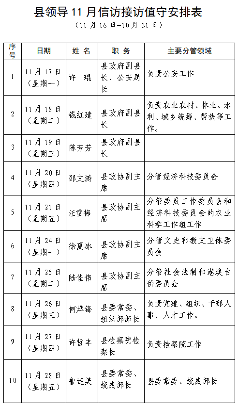县领导11月接访值守安排表(11月16日—11月31日)
