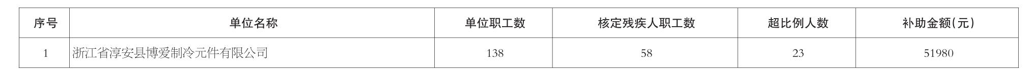 根据《浙江省残联等6部门单位关于印发《浙江省超比例安排残疾人就业企业奖励办法(试行)》等3个办法的通知》(浙残联发〔2021〕24号)相关规定,淳安县残联对本县集中就业企业超比例安置残疾人的用人单位进行超比例奖励。以下单位经审核符合申领(超比例奖励)相关条件,现予以公示。