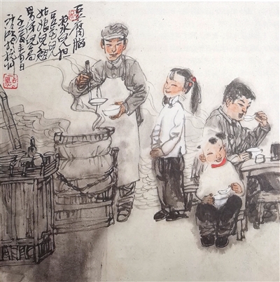 那时的豆腐脑担做得既科学又精巧。担子的一头是装有格挡的架子,架子上置有一烧鲜汤的铁锅,铁锅里炖着粉丝排骨汤,格挡上放着葱花、辣椒粉、虾皮、油条末、油渣、麻油、酱油等调料;担子的另一头是保温大桶,木桶里盛满豆腐脑。高声叫卖引来尝鲜的客人,卖家会舀一碗豆腐脑,加入粉丝排骨汤和各种调料,用石瓢一拌,色香味俱全的美食即成。