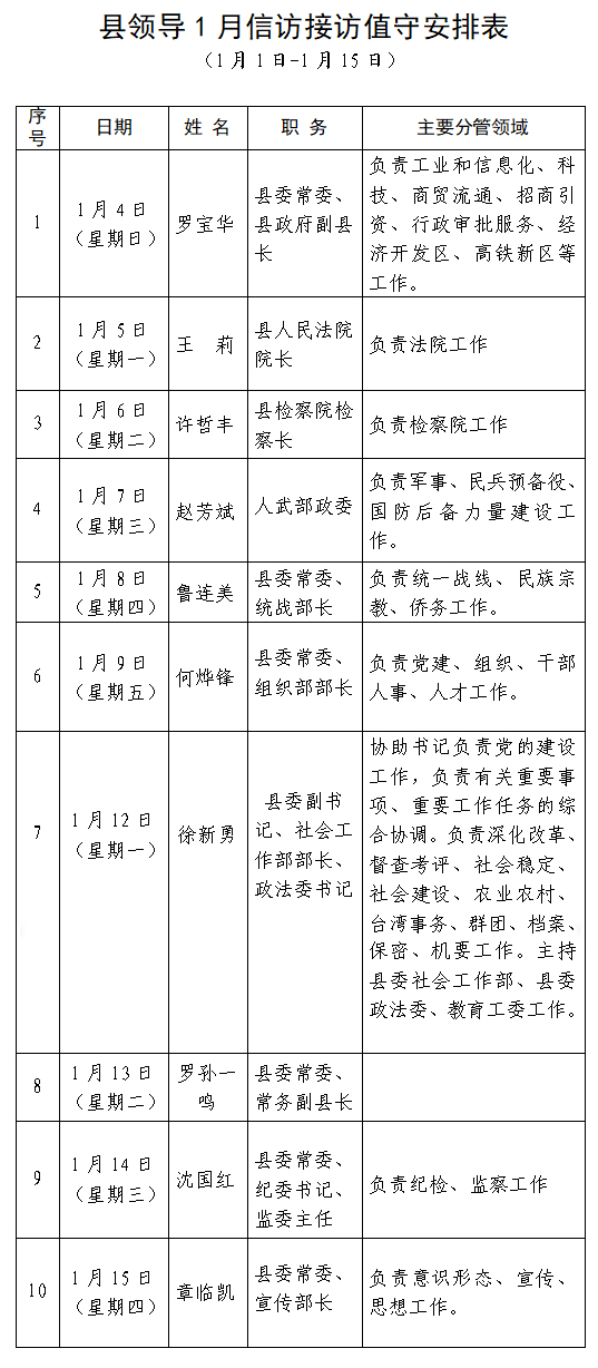 县领导1月接访值守安排表(1月1日—1月15日)