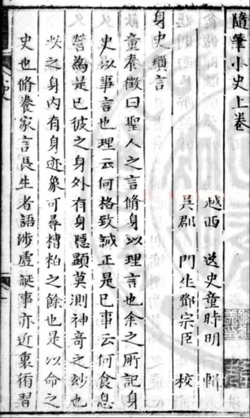 国家图书馆藏《随笔小史》,又称《随笔四小史》。全书一册,分上下两卷。上卷卷首有江右古临思瑕陈朝璋序,童时明自序(引)和目录。童时明自称“青溪散人”“越西逸史”。此书编于常熟县丞任上,刊刻于任永淳知县之后。