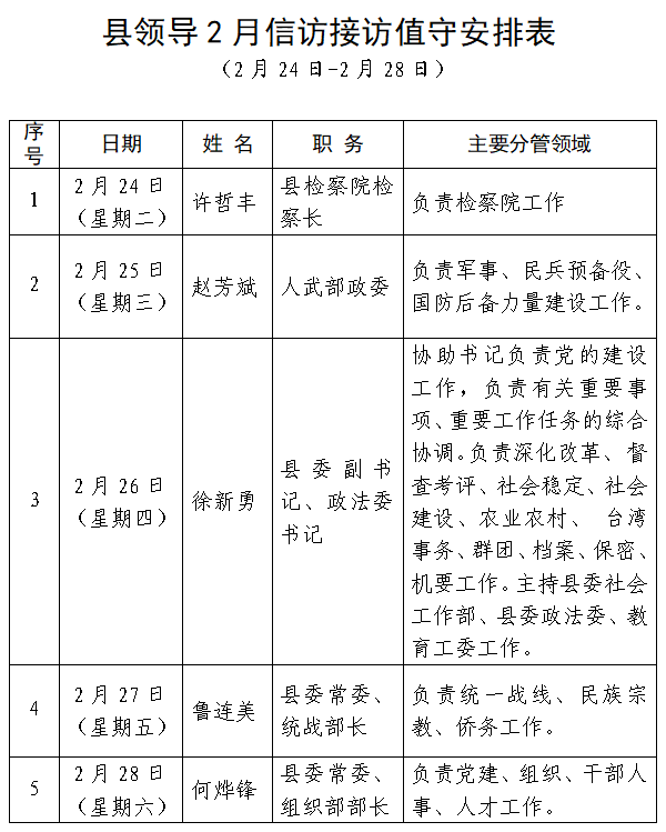 县领导2月接访值守安排表(2026年2月24日—2月28日)