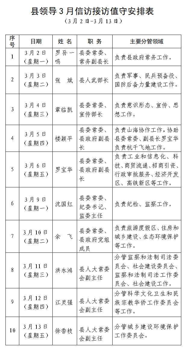 县领导3月接访值守安排表(2026年3月2日—3月13日)