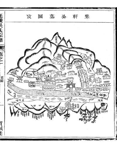 《延陵吴氏宗谱》卷一中《乐轩公(吴超)墓图考》,绘出了城西古城庄一带的景象。吴氏宗祠至德堂附近有环翠门(西门)、对面有南山、雉山。