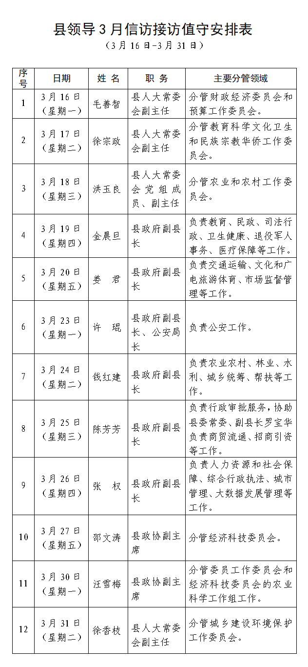 县领导3月接访值守安排表(2026年3月16日—3月31日)