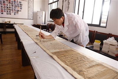 《吴氏家宝》长卷之题款卷经浙江省博物馆副研究员、纸质文物保护专家刘德龙修复完毕,昔日破旧不堪的长卷通过传统的修旧如旧可逆的方式修复,得以更好地传承。
