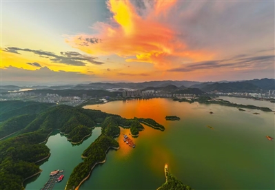 傍晚,千岛湖湖面被晚霞晕染成绚丽画卷。霞光在湖面形成倒影,翠绿岛屿、湖畔建筑与远山在光影中相映,自然与人文景观交融,尽显山水诗意壮丽。