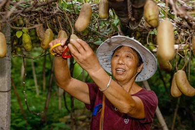 近日,在浪川乡狮古山村的八月瓜种植基地,藤蔓间挂满了“八月炸”,农户手持剪刀熟练采摘。曾是山间野果的八月瓜,经新农人陈志毅多年培育,已成为“网红”水果,深受市场追捧。
