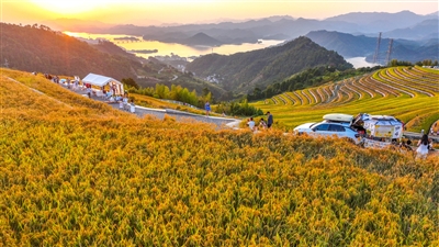 近日,在千岛湖镇青溪村长岭上自然村,层层梯田铺满金黄稻穗,在夕阳的晕染下熠熠生辉,宛如大地的金色织锦。这绝美的田园风光吸引了众多游客前来休闲游玩,或漫步稻田间,或驻足观景台,在山水与稻浪的交融中,尽享乡村文旅的独特魅力。