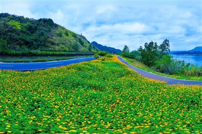 最引人注目的是成片的硫华菊,金黄色的花朵在阳光下熠熠生辉,与千岛湖的碧水蓝天相映成趣。