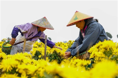 采收现场一片繁忙景象,十余位周边村庄的村民背着竹筐,正熟练地挑选成熟花朵。“采花可有讲究,杂色、花芯脱落或者尺寸不达标的都要剔除,只留品相完好的鲜菊。”正在田间采摘的村民方大妈笑容满面地说。
