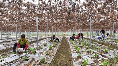 在金娃娃菜种植区,原本闲置的田地如今绿意盎然,十余位村民脚踩胶靴、手持小锄头,在田间来回穿梭,有条不紊地栽种菜苗。“我们在自己家门口就业,干农活离家近,既能照应家里,还有稳定收入,男的一天90块钱,女的一天80块钱,特别好。”村民黄苏林一边忙活一边说道,脸上洋溢着满足的笑容。
