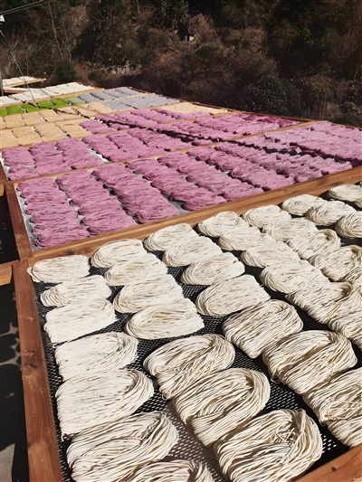 “传统日晒面,靠的是自然阳光,不仅耗时长,对场地、天气的要求也很高,品质也受到师傅手艺的影响。”为了攻克这一难题,石林镇规模最大的日晒面企业负责人王飞与左建平经历了不少次失败。