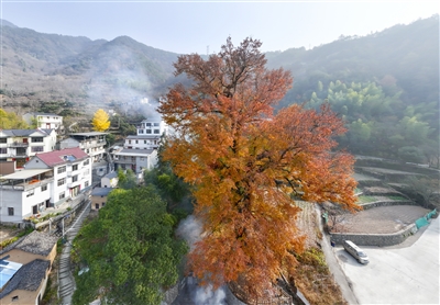进入12月以来,金峰乡下江自然村的“夫妻枫”金黄灿烂,在阳光下熠熠生辉,引得游客争相拍照打卡。“夫妻枫”树龄超510年,高33米,是省一级保护树木、“华东十大古木”。通讯员 王建才