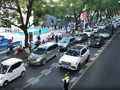 停车场出入口的“巧转换”则解决了“最后一百米”的拥堵。十字街外高桥酒店停车场曾因进口正对主干道,车辆排队时常造成路面交织。交警部门通过调整出入口方向、更新道闸系统,彻底消除了冲突点。如今,该停车场出入口拥堵警情清零,周边商户说:“以前顾客总抱怨停车堵,现在再也没这种烦恼了。”截至目前,城区8个类似问题的停车场均完成改造,通行效率显著提升。