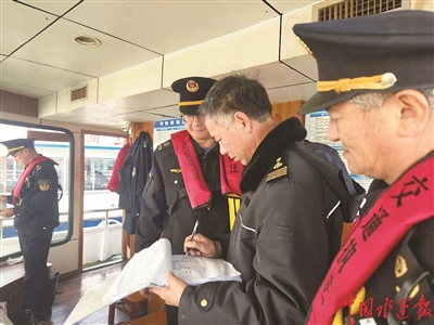 开展船舶安全检查,执法人员聚焦安全隐患大排查、船舶及港口防污染等水上交通执法重点领域、重点环节,对标对表检查码头停靠船舶,仔细查看船舶配员情况、船舶救生消防设备、AIS设备、监控定位设施、通讯设备、船舶证书、航行日志、开航前安全自查情况等内容,随机抽查船员履职资格和实操能力,确保船舶适航、船员适任。