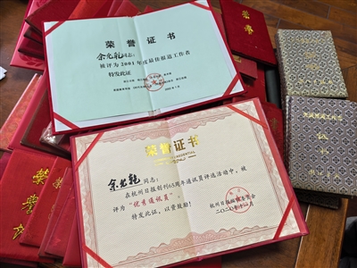 在报道组组长岗位上履职十三载,余允乾笔耕不辍、硕果累累,累计在全国及省、市各级报刊刊发新闻稿件4000余篇,平均每年刊发300多篇,近乎每日都有作品见报。他的新闻作品屡获殊荣,100多本全国及省、市好新闻奖荣誉证书,摆满了他的书桌。他连年获评《浙江日报》《杭州日报》先进个人,还斩获《杭州日报》最佳通讯员称号,成为当时淳安获此殊荣的唯一一人;更获评《浙江日报》“全省最佳报道工作者”,这一荣誉在彼时的杭州地区,同样仅有他一人摘得。
