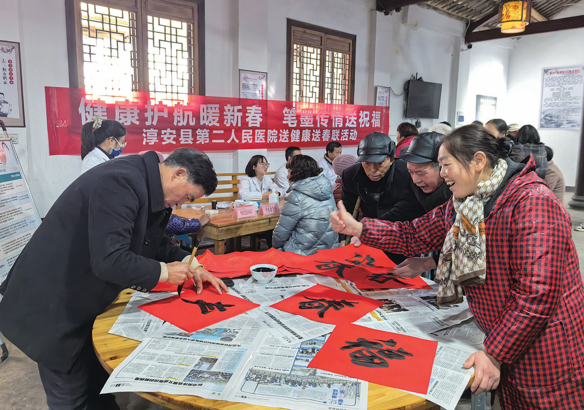 淳安二院党员志愿服务队特邀书法老师走进汾口镇鲁村村文化礼堂,开展“健康护航暖新春”活动。活动现场,内科、外科、中医康复科等学科的党员医护骨干,耐心为村民提供常见病、慢性病咨询、免费血压血糖测量、个性化用药指导及急救知识演示,细致解读病历、指引就医路径,切实将县级优质医疗资源延伸至基层“最后一公里”。一旁的书写区,书法老师按需挥毫,一幅幅寓意吉祥安康的春联、一张张满载祝愿的“福”字,伴着健康叮嘱送到村民手中。此次活动惠及村民近80人次,发放健康宣教资料百余份。