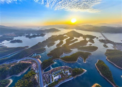 清晨,朝阳穿透薄雾,为千岛镶嵌金边,湖山相依间尽显“天下第一秀水”的生态之美。