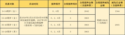 惠民对象:不限户籍(年龄如下表),且既往无九价HPV疫苗接种史,无HPV疫苗接种禁忌。