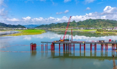 近日,杭淳开高速公路淳安段建设现场一派繁忙景象。钢栈桥横跨澄澈湖面,红色桩基深深扎根水中,大型起重机械等设备有序作业,在碧水青山间勾勒出一幅热火朝天的奋进施工图景,为区域交通互联互通按下“加速键”。