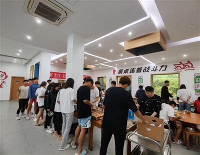 午饭时候,年轻健壮的运动员们围坐在一起吃饭,每个人的筷子夹得满满,埋着头吃,香得馋人。